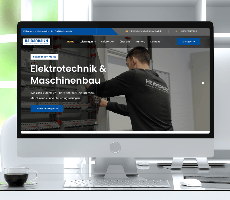 Für Heidenreich Elektrotechnik durften wir den kompletten Webauftritt neu konzipieren und umsetzen. Neben einem modernen, responsiven Webdesign lag der Fokus auf einer klaren UX/UI-Struktur und einer umfassenden SEO-Optimierung zur besseren Sichtbarkeit bei Google. Ergänzend entwickelten wir einen gezielten Recruiting-Funnel zur Mitarbeitergewinnung. Das Ergebnis: 36 qualifizierte Bewerbungen in kurzer Zeit über die neue digitale Bewerbungsstrecke.